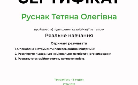 В жовтні 2025 р. директор ЗДО №11 “Горобинка” підвищила кваліфікацію за темою “Реальне навчання” та отримала відповідний сертифікат.