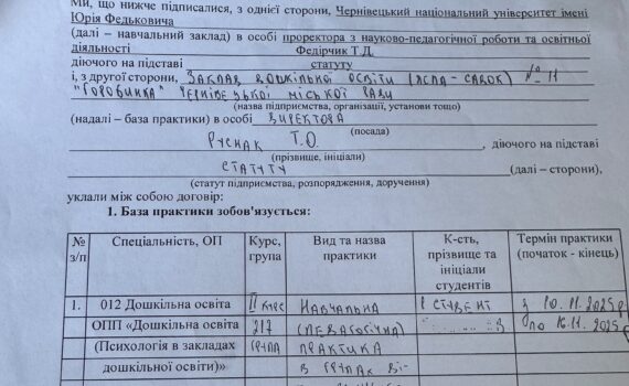 На підставі заключеного договору про співпрацю між ЗДО №11 “Горобинка” та ЧНУ ім.Ю.Федьковича з 10.11.2025 р. по 16.11.2025 р. на базі нашого закладу проходила практика студентки ІІ курсу, спеціальності “Дошкільна освіта”.