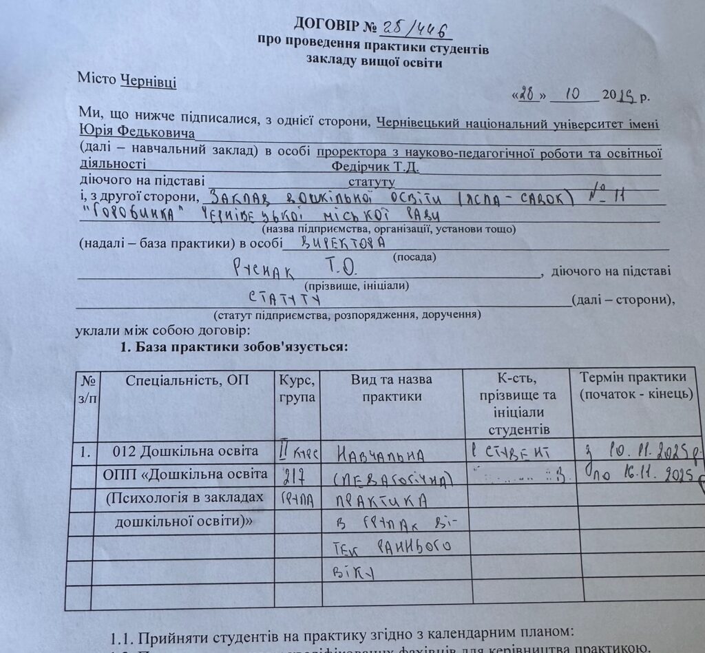 На підставі заключеного договору про співпрацю між ЗДО №11 “Горобинка” та ЧНУ ім.Ю.Федьковича з 10.11.2025 р. по 16.11.2025 р. на базі нашого закладу проходила практика студентки ІІ курсу, спеціальності “Дошкільна освіта”.