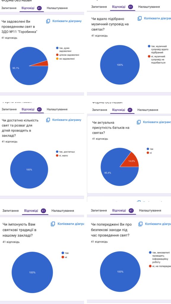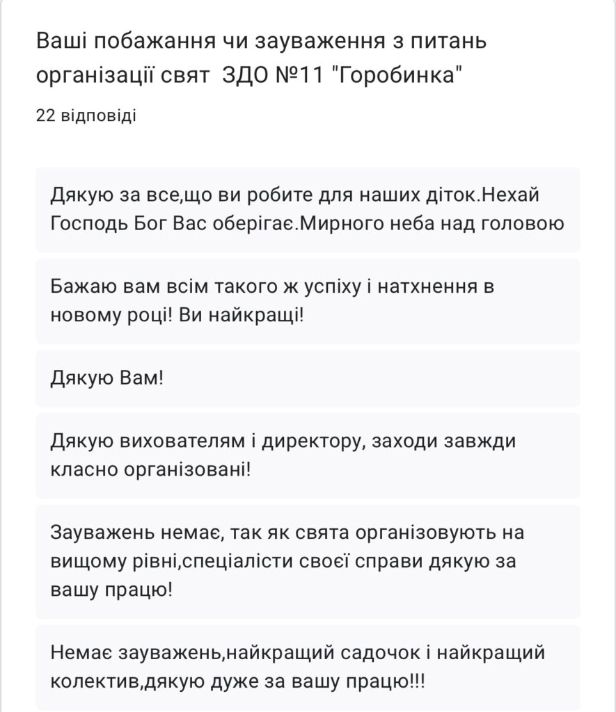 В грудні 2025 р. в ЗДО №11 “Горобинка” було проведено анонімне опитування батьків щодо організації та проведення свят і заходів для дошкільнят закладу. Дякуємо батькам за активність в проведенні опитування, адже нам важлива Ваша думка!