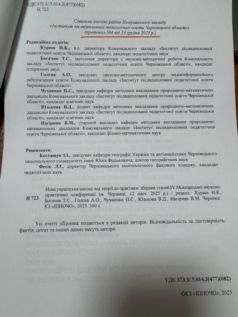 Наукову статтю директора ЗДО №11 “Горобинка” Тетяни РУСНАК обрано до друку в збірнику конференції в грудні 2025 р., що засвідчено виданням збірника, який схвалено вченою радою Комунального закладу “Інститут післядипломної педагогічної освіти Чернівецької області” (протокол №4 від 23 грудня 2025 р.).