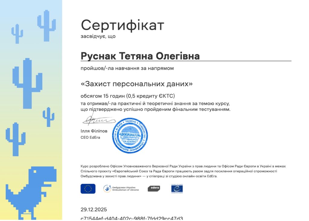 Тетяна РУСНАК, директор ЗДО №11 “Горобинка”, в грудні 2025 р. пройшла кваліфіковане навчання з питань захисту персональних даних в рамках ведення кадрової роботи, як роботодавець закладу